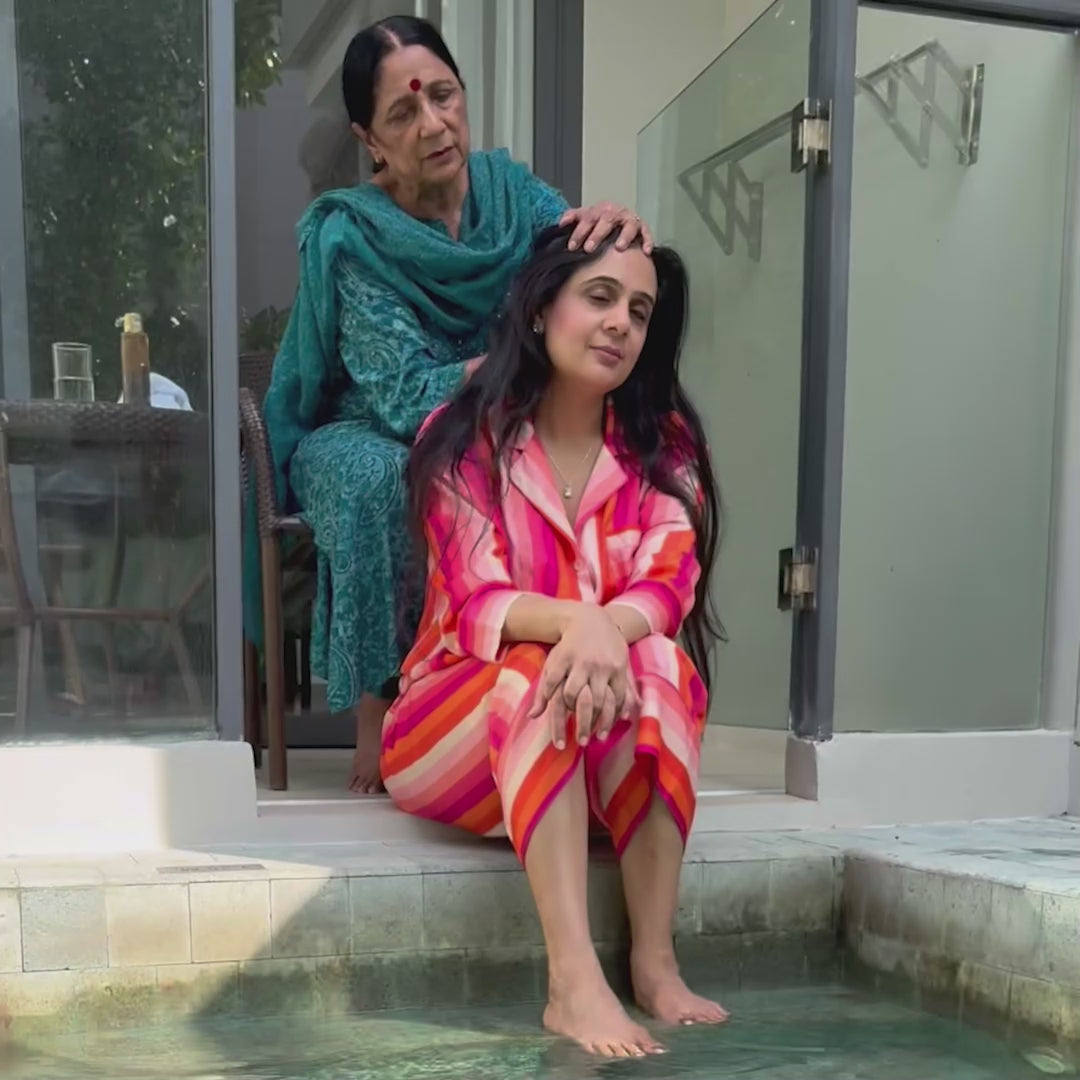 , a heritage blend of potent herbs and fresh botanicals crafted through ancient Indian infusion methods. Rich in visible herbs like Bhringraj, Amla, Brahmi, and Hibiscus, this oil is designed to tackle multiple hair concerns—from dryness to dandruff—naturally and effectively.